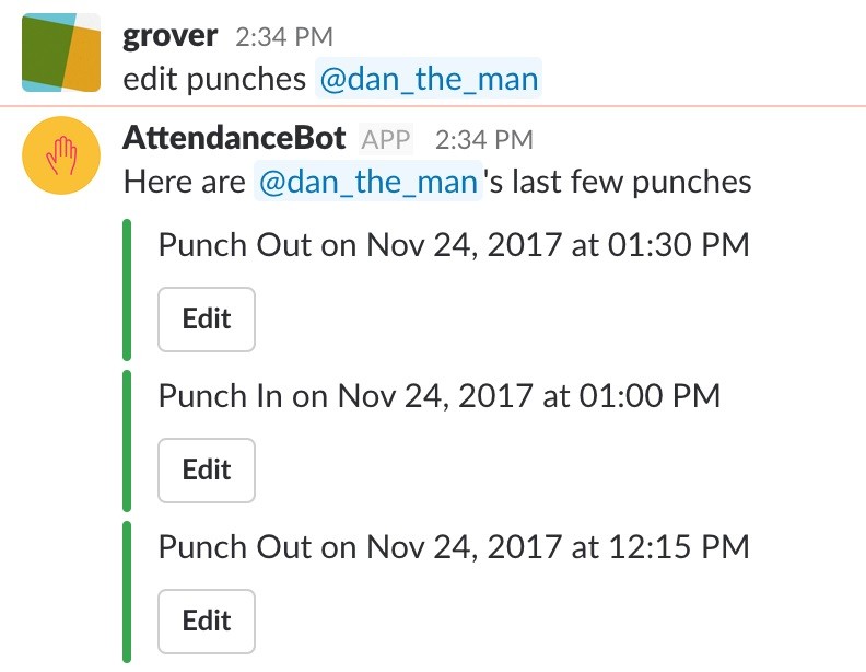 AttendanceBot is a time tracking and leave management Slack integration which lets the whole team know if a worker is at their computer, on leave, in a meeting or working remotely.
