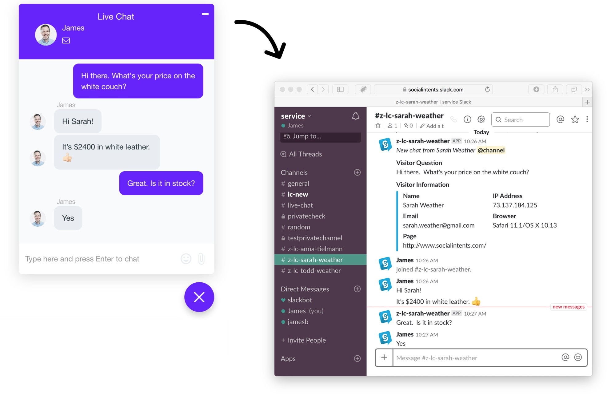 Social Intents’s Live Chat for Slack lets you chat with website visitors right from Slack. This application is designed to work seamlessly for your team. All you have to do is add Live Chat to your Slack, then copy 1 line of code to your site and your entire team will be ready to give your visitors real-time chat support.