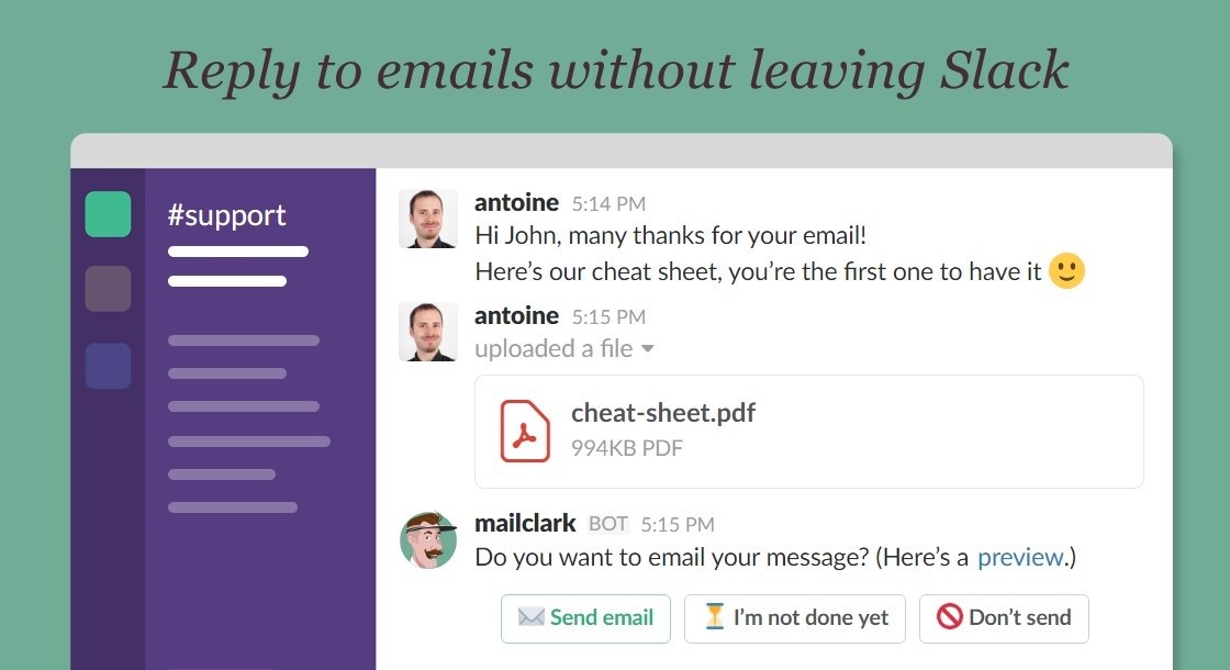 MailClark is a really useful Slack app, but there are more apps on the market with the same features. A Slack app similar to MailClark that we really like is PigeonBot. This Slack app lets you send emails to people on your channels from Slack using a simple command.