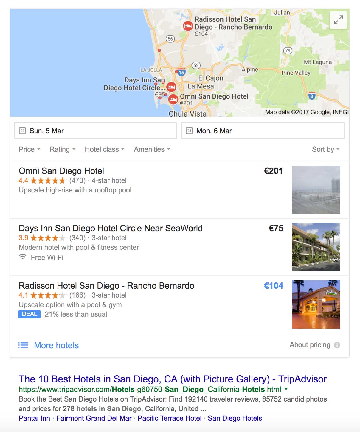 Local search results on Google, an example showing results for “hotels in San Diego”