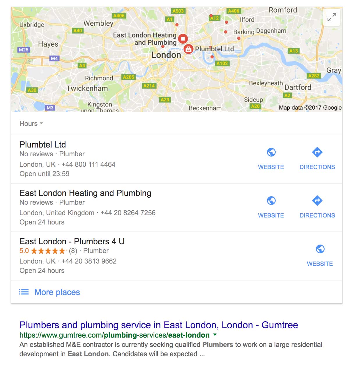 Here we searched for plumber east London, you can see that again we have top 3 plumbers and links to their websites and Google Place profiles.